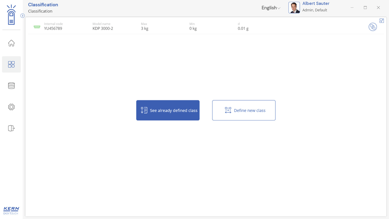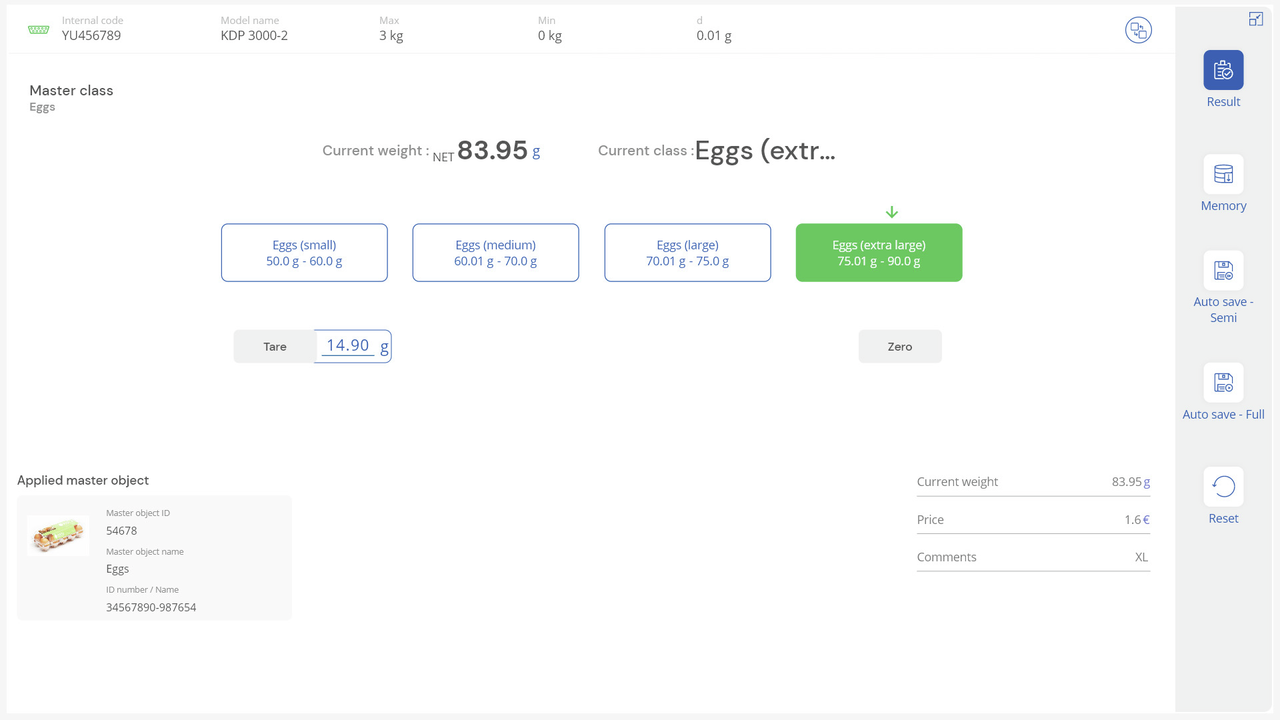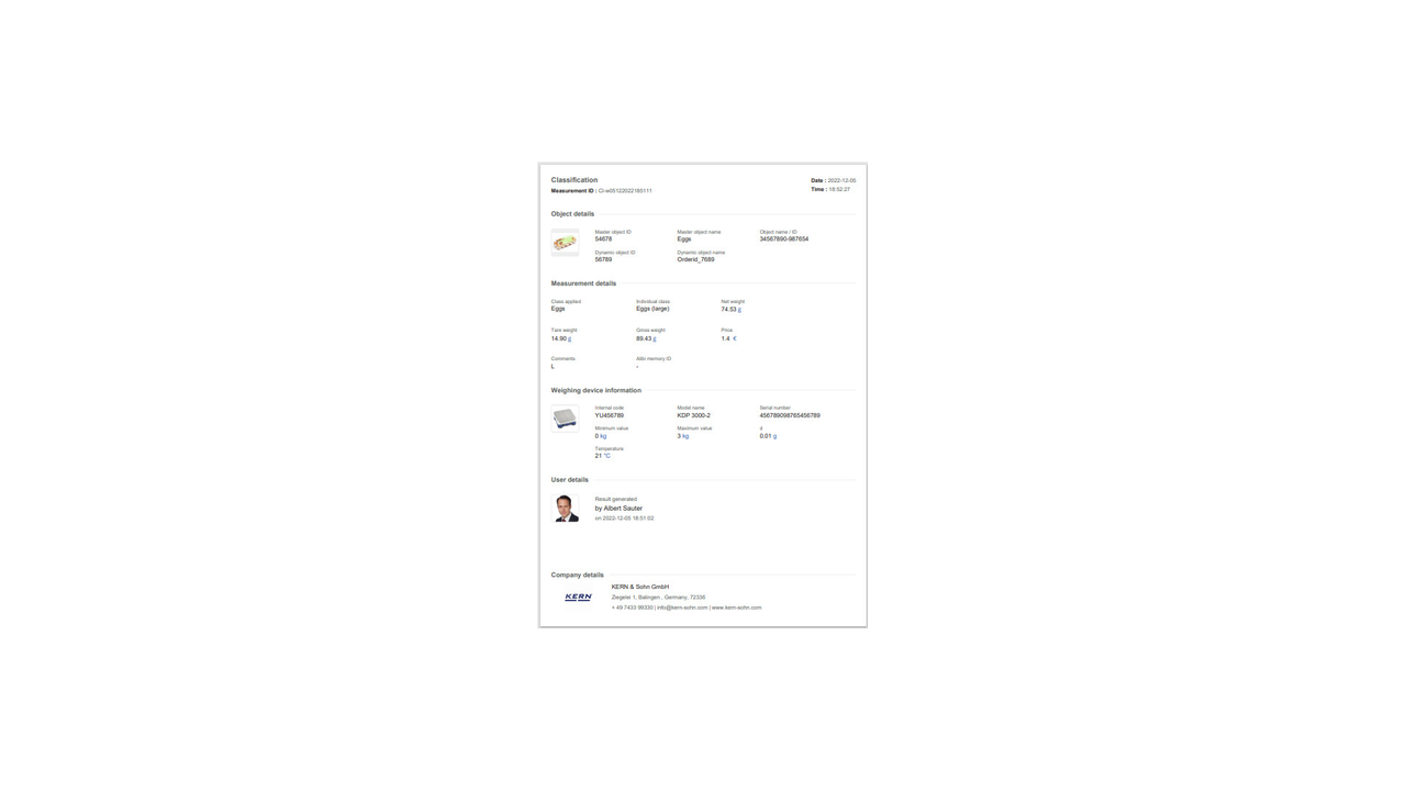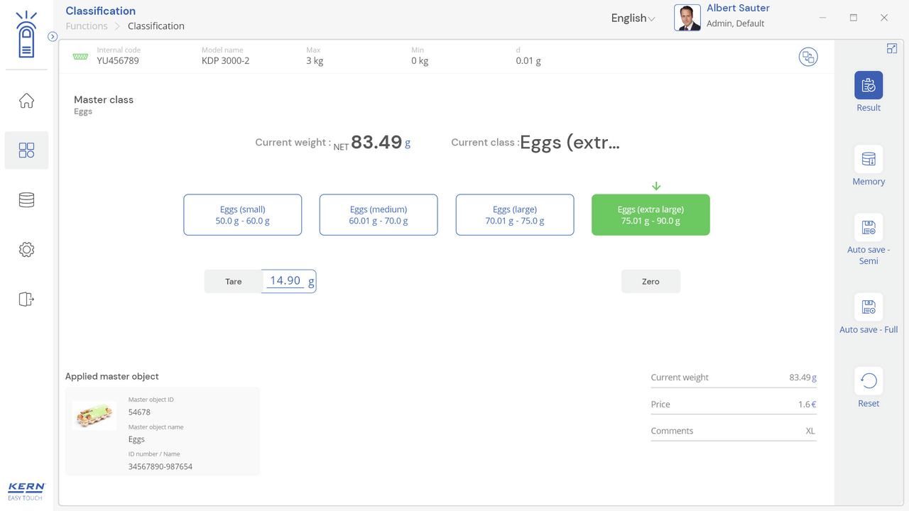 Note: Prerequisite for this set is the basic program SET-01 Base;The job of the classification function is to group weighing objects into specific weight classes. These weight classes can be freely determined. This function is for simple, convenient sorting of objects and avoids the user having to read out and interpret the weighing result;Display of the classification result: In the result, the correct weight class in relation to the current object to be weighed is displayed in plain text. In addition, the current weight class is highlighted as a colored field and the weighing result within the weight class field is displayed visually supported by a small arrow, similar to a bar graph display;Entering tolerance classes can be carried out conveniently using individual class names (which will be automatically incremented) with lower and upper tolerance values, with a price and individual comment for each class if required. As an alternative, predefined class descriptions can also be selected and these may have individual limits;Endless classes are possible: Class limits from 0 to a target value or from a target value to infinity can be selected as class limits. You can also set class limits with gaps. These gaps are handled as “class-less”;Central master data memory: Classification objects can be stored in the memory of the system with classification profile, class name, appropriate lower and upper tolerance values, if necessary price and comment depending on the class, as well as ID number and ID name, image, etc. In this way these values do not have to constantly be entered again, but can be easily recalled from the memory. In the master data memory you can also store a possible tare value for the typical packaging, box or container which is typically used for the object and which will then be deducted automatically from the weighing result;ID security: “ID security” offers the possibility of storing each weighed and stored classification result with a unique ID number (Dynamic Object ID) and an ID name (Dynamic Object Name). The saving process can be triggered on a semi-automatic or fully-automatic basis and always after the load has been taken off the balance and when load is applied again. This means that the user does not have to press any buttons for mass storage operations and can work efficiently;PC print function and barcode scanning function: By operating KERN EasyTouch in a Windows® or Android™ environment you can use the full PC/tablet accessory infrastructure. In particular, standard Windows printers and PC label printers can print out extensive counting slips or compact adhesive labels with the count result to suit your requirements;Options;The central data memory function Save Server (SET-10) for additional storage of all measurement data in a central, local server directory. By doing this the measurement data of all connected EasyTouch weighing systems as well as from all installed EasyTouch functions will be stored. A particular benefit of doing this for those users with several weighing systems is that all weighing data is consolidated in just one database and you can search for individual measurement data from several balances in just one table. The Save Server data memory is also tamper-proof and cannot be changed;