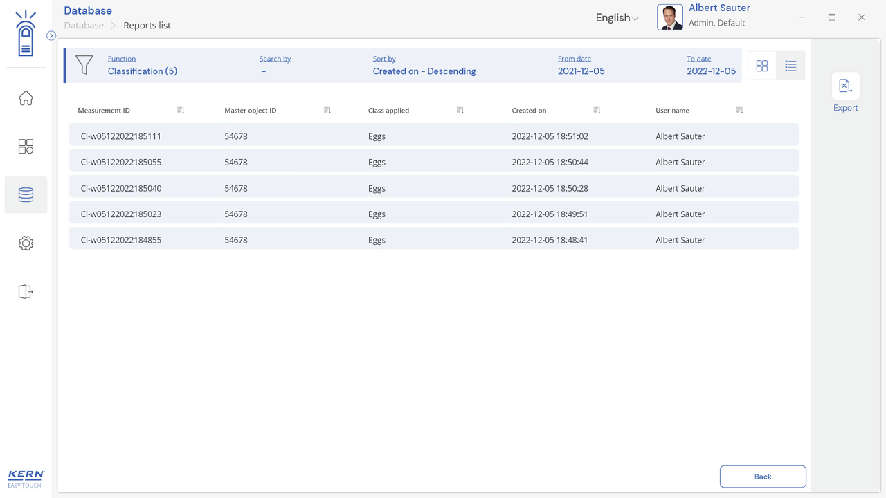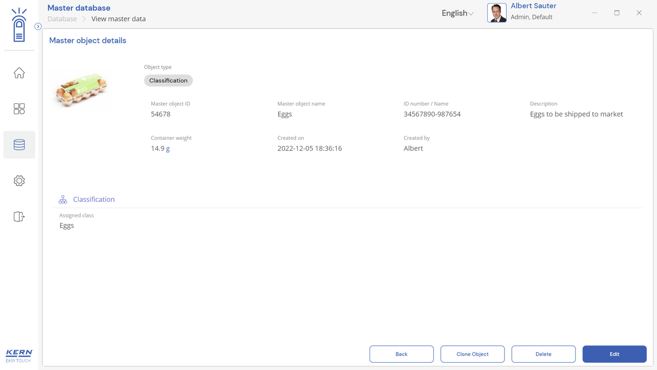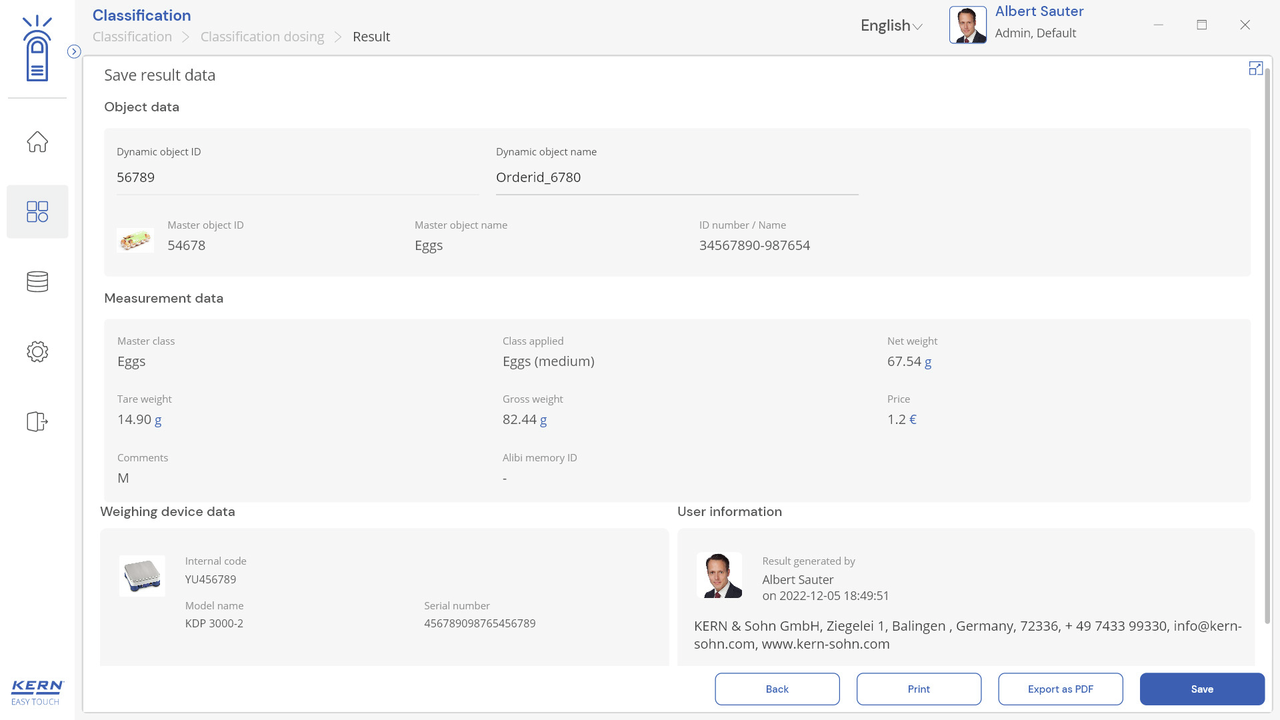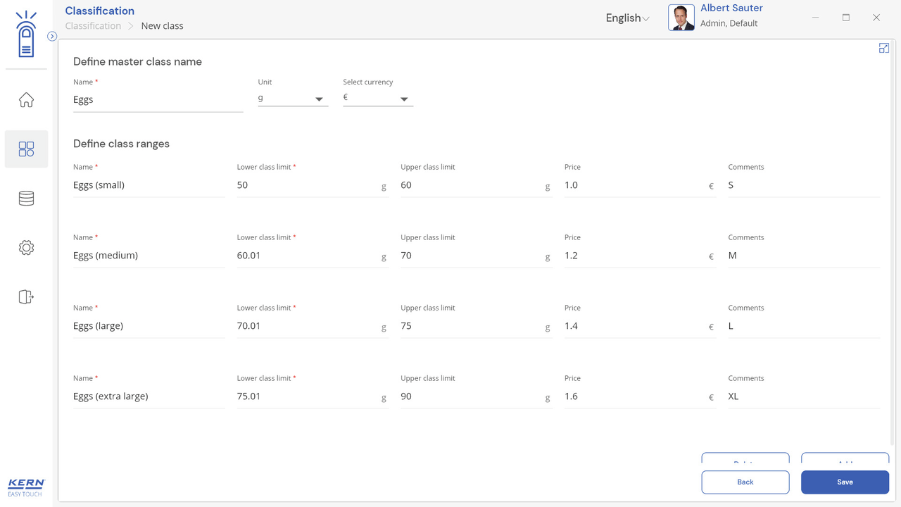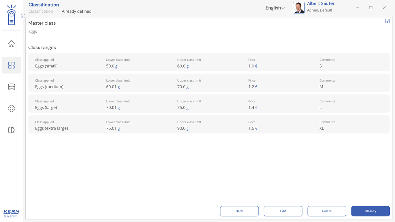 Note: Prerequisite for this set is the basic program SET-01 Base;The job of the classification function is to group weighing objects into specific weight classes. These weight classes can be freely determined. This function is for simple, convenient sorting of objects and avoids the user having to read out and interpret the weighing result;Display of the classification result: In the result, the correct weight class in relation to the current object to be weighed is displayed in plain text. In addition, the current weight class is highlighted as a colored field and the weighing result within the weight class field is displayed visually supported by a small arrow, similar to a bar graph display;Entering tolerance classes can be carried out conveniently using individual class names (which will be automatically incremented) with lower and upper tolerance values, with a price and individual comment for each class if required. As an alternative, predefined class descriptions can also be selected and these may have individual limits;Endless classes are possible: Class limits from 0 to a target value or from a target value to infinity can be selected as class limits. You can also set class limits with gaps. These gaps are handled as “class-less”;Central master data memory: Classification objects can be stored in the memory of the system with classification profile, class name, appropriate lower and upper tolerance values, if necessary price and comment depending on the class, as well as ID number and ID name, image, etc. In this way these values do not have to constantly be entered again, but can be easily recalled from the memory. In the master data memory you can also store a possible tare value for the typical packaging, box or container which is typically used for the object and which will then be deducted automatically from the weighing result;ID security: “ID security” offers the possibility of storing each weighed and stored classification result with a unique ID number (Dynamic Object ID) and an ID name (Dynamic Object Name). The saving process can be triggered on a semi-automatic or fully-automatic basis and always after the load has been taken off the balance and when load is applied again. This means that the user does not have to press any buttons for mass storage operations and can work efficiently;PC print function and barcode scanning function: By operating KERN EasyTouch in a Windows® or Android™ environment you can use the full PC/tablet accessory infrastructure. In particular, standard Windows printers and PC label printers can print out extensive counting slips or compact adhesive labels with the count result to suit your requirements;Options;The central data memory function Save Server (SET-10) for additional storage of all measurement data in a central, local server directory. By doing this the measurement data of all connected EasyTouch weighing systems as well as from all installed EasyTouch functions will be stored. A particular benefit of doing this for those users with several weighing systems is that all weighing data is consolidated in just one database and you can search for individual measurement data from several balances in just one table. The Save Server data memory is also tamper-proof and cannot be changed;