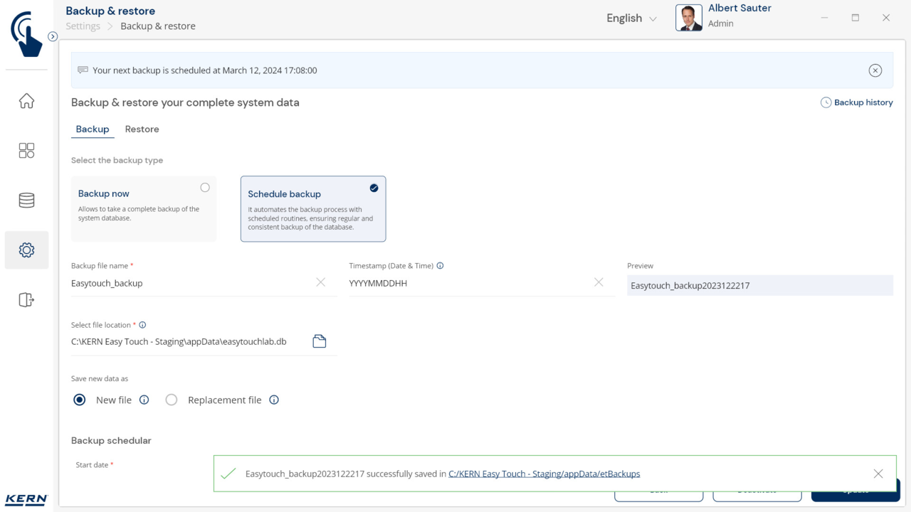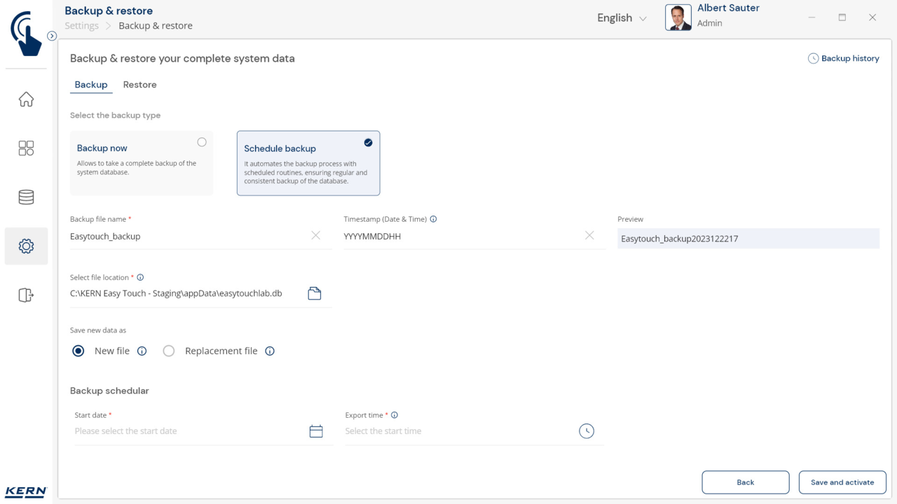 Restore: In the event of a fault, the last saved backup can be easily restored using the "Restore" function