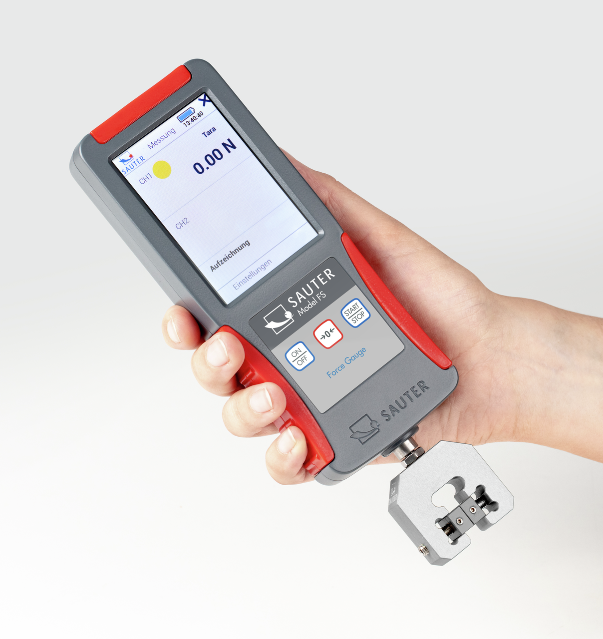 The SAUTER FS premium force gauge has an load measuring cell for tensile and compressive force applications. Either mobile for rapid testing or stationary integrated into a test stand or production line, the multifunction display allows all the values recorded to be read off at a glance in real time. Via the integrated interface, the data can be sent to a PC or laptop for further processing. - Use with external load cells